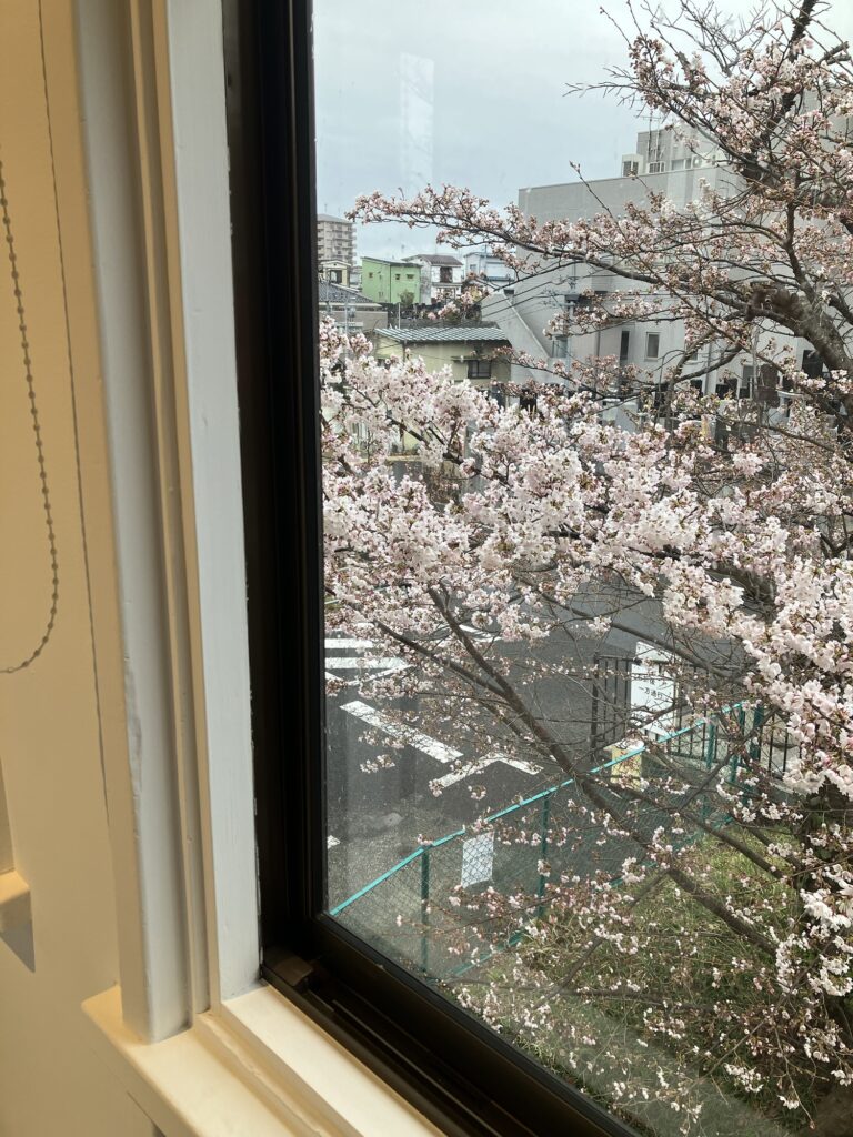 美術館の窓から見える桜。